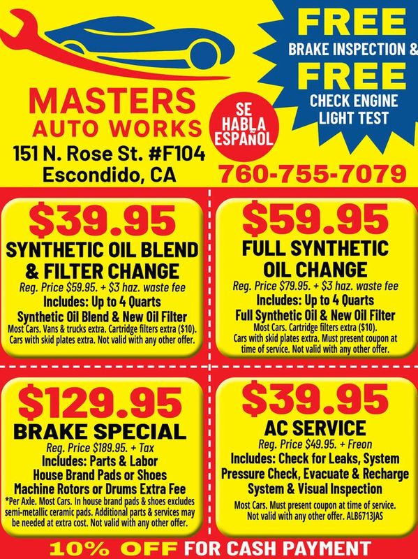 Masters Auto Works is your trusted auto repair and maintenance shop in Escondido, CA. Conveniently located at 151 N Rose St Suite F104, we specialize in providing reliable, honest, and high-quality automotive services. From routine oil changes and brake repairs to engine diagnostics, transmission work, and everything in between, our experienced technicians are dedicated to keeping your vehicle running at its best. We pride ourselves on exceptional customer service, transparent pricing, and efficient turnaround times. Whether you need preventive maintenance or complex repairs, Masters Auto Works is your go-to shop for expert care and lasting results.